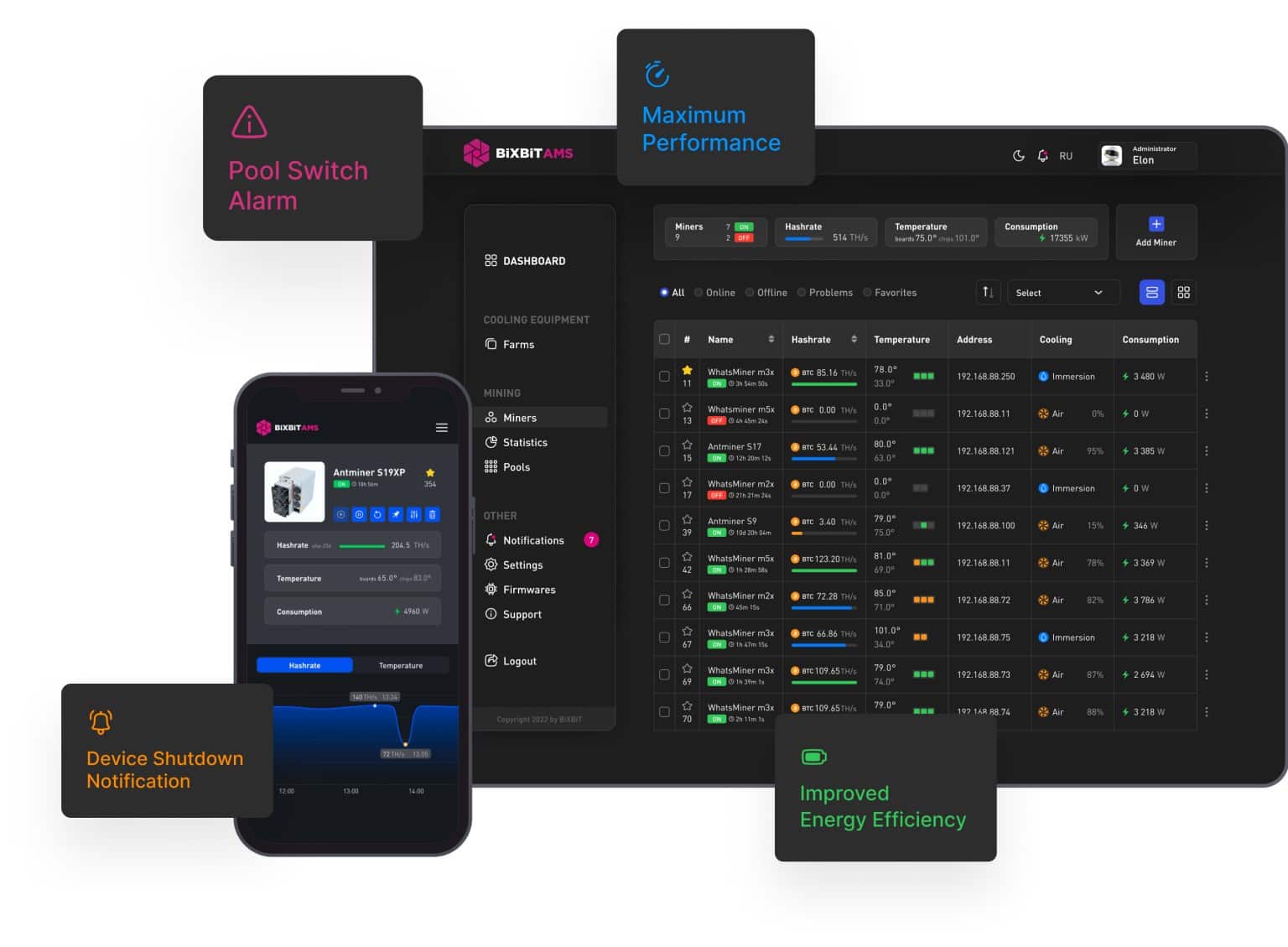 Be constantly aware of the hashrate, temperature, power consumption and profitability dynamics as of one miner or the entire farm.