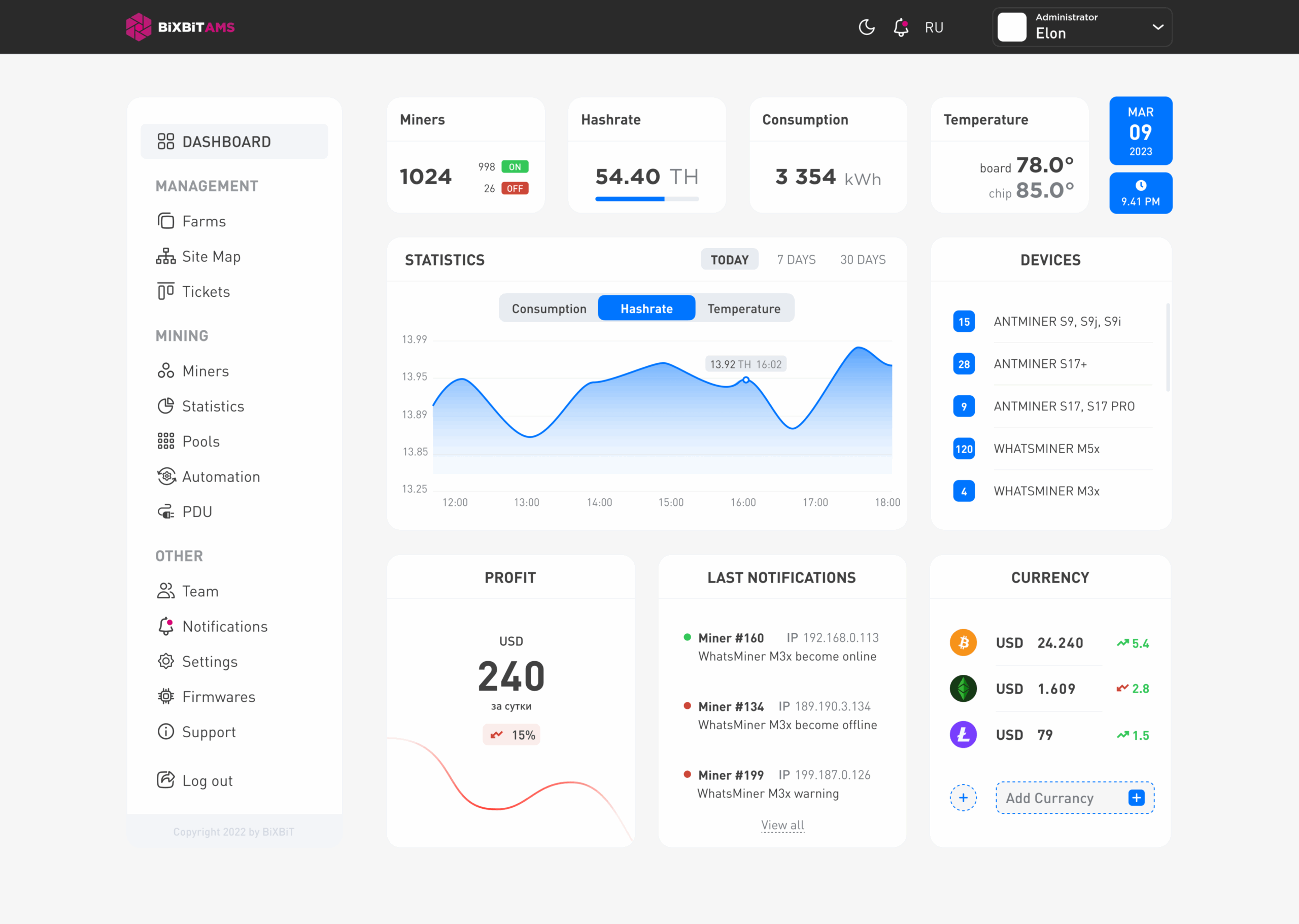 Your personal BiXBiT AMS account helps you keep track of various things during the miners' work for later analysis over a period of time.